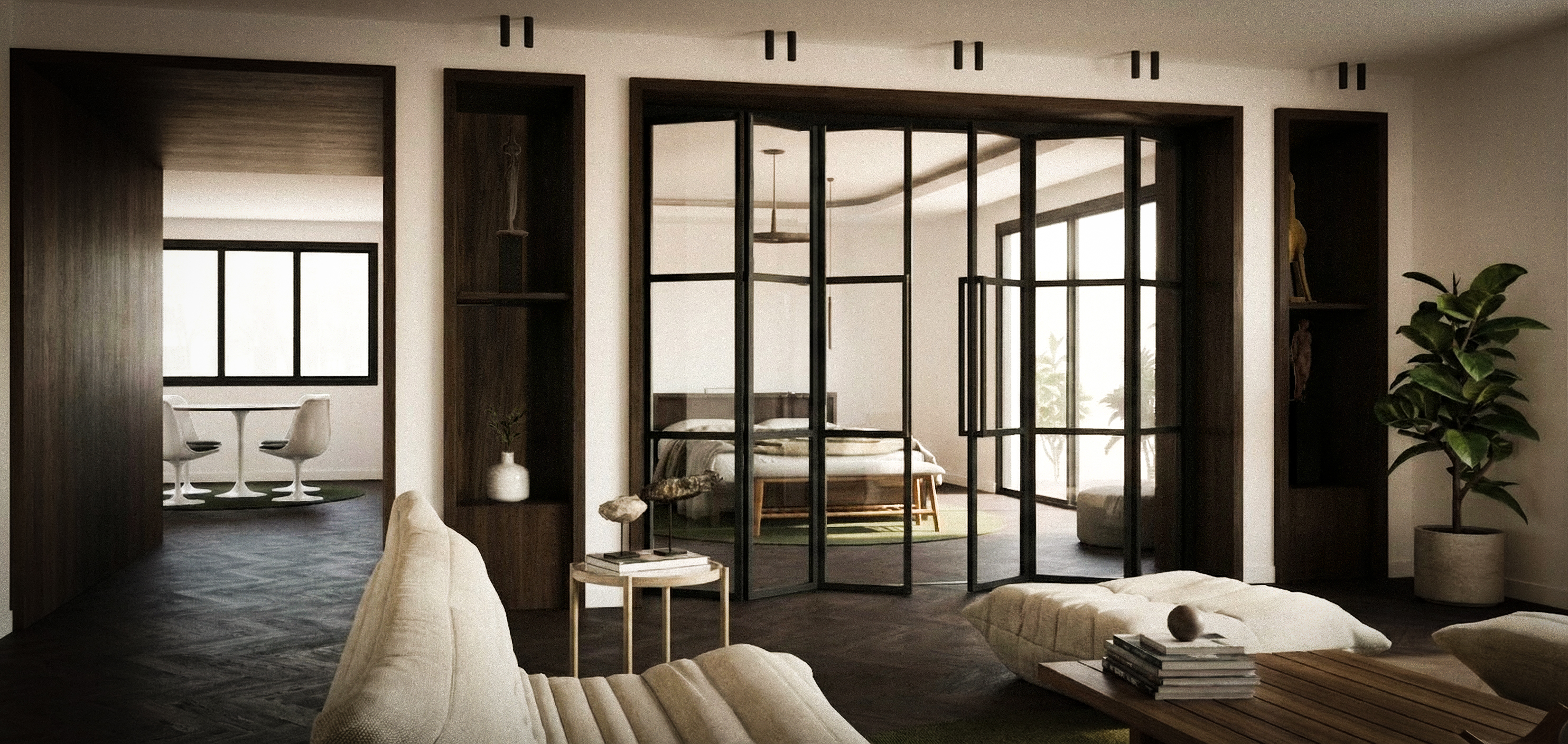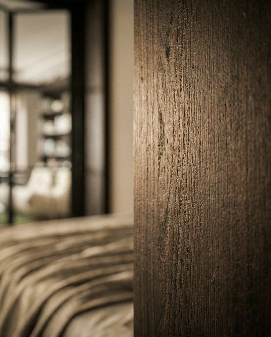 Materials are reduced to a minimal palette, creating a coherent and grounded atmosphere.